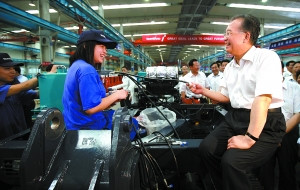 7月2日,溫家寶在長沙一公司車間與工人交談。新華社發