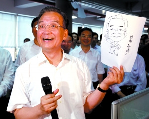 7月2日,國務院總理溫家寶在長沙拓維信息系統公司考察時接受員工贈送的漫畫像。新華社記者姚大偉攝