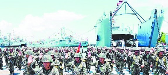 5月9日,菲律賓出動(dòng)3艘軍艦駛向仁愛礁。據(jù)《環(huán)球時(shí)報(bào)》記者從權(quán)威渠道得知,這3艘菲律賓海軍軍艦包括一艘PS36“孔雀”級(jí)巡邏艦、一艘PS74驅(qū)逐艦和一艘PS71運(yùn)兵艦。奧妙在于運(yùn)兵艦上——它搭載的不只是兵員,而是大量的礁盤建筑材料,這些材料是菲律賓海軍工兵試圖修復(fù)坐灘仁愛礁的菲律賓破軍艦及其上面所搭建的臨時(shí)建筑,從而強(qiáng)化其對(duì)仁愛礁的侵占。