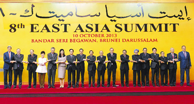本報斯里巴加灣市10月10日電 (記者吳樂珺、王慧)國務院總理李克強10日在文萊斯里巴加灣市出席第八屆東亞峰會。東盟十國以及韓、日、美、俄、印度、澳大利亞、新西蘭等國領導人或代表出席。文萊蘇丹哈桑納爾主持會議,各國領導人圍繞東亞合作發展、有關國際地區問題和全球性議題交換意見。