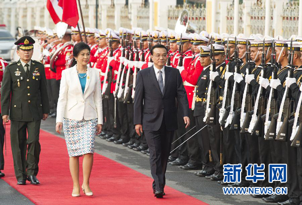 英拉代表泰國政府和人民熱烈歡迎李克強來訪,表示中國是泰國的友好鄰邦,兩國親如一家。泰方贊同李克強進一步發展兩國關系的建議,愿以李克強總理此訪為契機,全面推進泰中各領域合作,進一步提升兩國關系水平。泰方贊賞李克強總理提出的東盟-中國“2+7”合作框架,愿為東盟-中國關系發展作出積極貢獻。