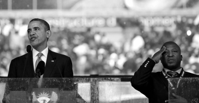 ▲10日,曼德拉官方追悼會上,奧巴馬致辭,揚奇在其身邊冒充手語翻譯。圖/東方IC