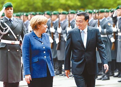 默克爾代表德國政府和人民熱烈歡迎李克強到訪。默克爾說,德中在政治、經濟、外交、人文等領域開展了良好合作,兩國關系十分緊密,達到前所未有的高水平。中國具有重要國際影響力,是德國的重要合作伙伴。德方愿與中方深化合作,加強交流互鑒,相互取長補短,共同推動德中戰略伙伴關系不斷向前發展。