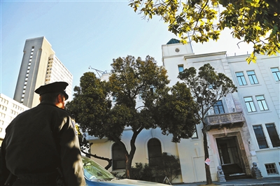 1月4日,一名警察在中國駐美國舊金山總領事館正門對面巡視。美國舊金山警方已經對中國駐當地總領事館實行24小時保護 新華社發