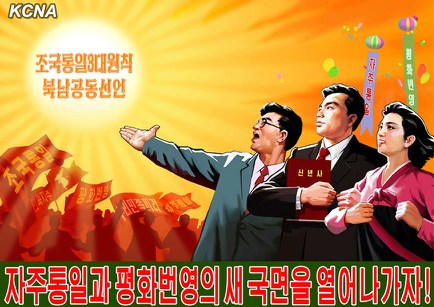 宣傳畫《堅決站在“由我們民族自己”的立場,尊重并誠實地履行共同宣言!》、《排斥外來勢力,堅持“由我們民族自己”的立場!》,表達了朝鮮全民族在統一三項原則和《北南共同宣言》的旗幟下,必定實現朝鮮半島統一的信念。