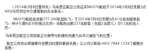 這份聲明標(biāo)記的時間為3月24日晚上10時15分。而在3月8日,馬航發(fā)表的聲明則表示“該航班運載227名旅客(包括2名嬰兒)及12名機組人員。”