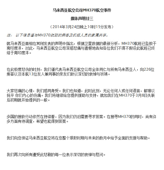 馬航官方網(wǎng)站上的《媒體聲明廿三》表示,“在此極度悲傷的時刻,我們謹(jǐn)代表馬來西亞航空公司全體同仁與所有馬來西亞人,向226位乘客以及本航13位友人兼同事的親友們致以深切的哀悼與祈禱。”