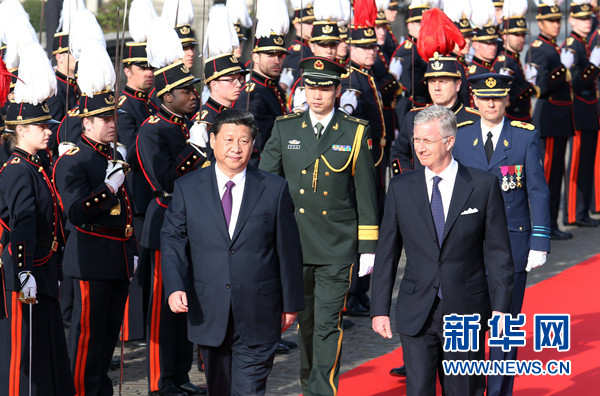 會見前,菲利普國王在王宮廣場為習近平舉行隆重歡迎儀式。習近平和夫人彭麗媛在比利時皇家馬隊護衛下抵達檢閱臺前,菲利普國王和瑪蒂爾德王后熱情迎接。兩國元首夫婦登上檢閱臺。軍樂隊奏中比兩國國歌。習近平在菲利普國王陪同下檢閱儀仗隊。