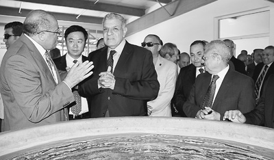 埃及臨時(shí)政府總理馬赫萊卜(左三)在中國(guó)援建的蘇伊士運(yùn)河大學(xué)漁業(yè)與水產(chǎn)教學(xué)培訓(xùn)中心視察時(shí),聽(tīng)取情況介紹。 |