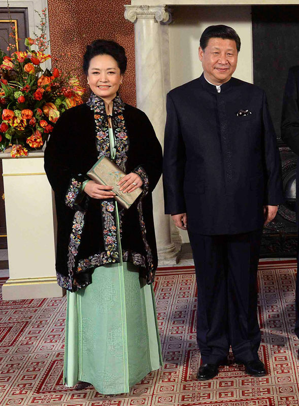 ——在出席威廉-亞歷山大國王舉行的國宴時,習主席與夫人彭麗媛都以中式服裝亮相。習主席穿著的中式服裝色彩飽和,略帶暗光澤,頗具莊嚴感;高密度高支紗的面料讓人感覺嚴謹與厚重;在設計上,暗門襟的設計將前胸的紐扣都隱藏起來,沉穩大氣,淡去人們對于中山裝的記憶。頗具巧思的是左前胸呼應西裝口袋巾的圖案設計,體現出對西方禮儀的尊重,也營造出輕松和諧的氛圍。彭麗媛穿著的是牡丹花刺繡的外套,內搭粉果綠的長裙,長裙很具有清新感,內藏著對綠色環保的崇尚。中國刺繡素來被西方人所崇尚,牡丹花自古被視為中國的國花,頗具傳統風格的粉果綠色彩,給人以清新感,同時內藏對綠色環保的崇尚。整套服裝具有很鮮明的中國特色,非常符合中國人的審美觀,又符合西方時尚,并且廓形感很強。