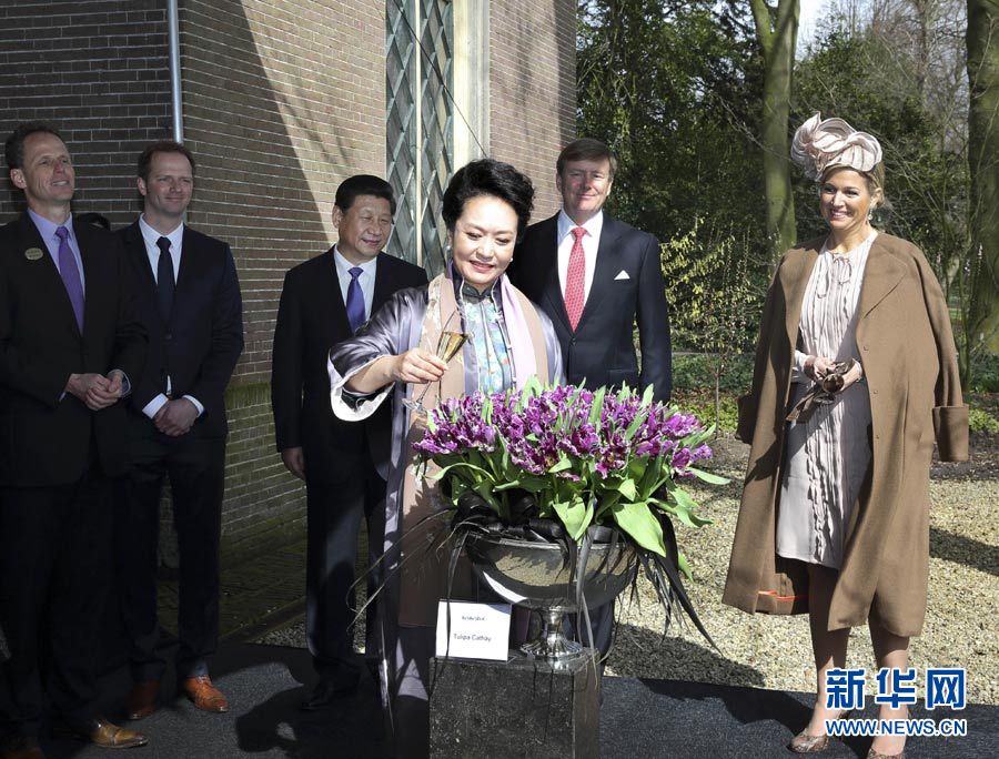 3月23日,中國國家主席習近平和夫人彭麗媛在荷蘭國王威廉-亞歷山大和馬克西瑪王后陪同下參觀中荷農業合作和荷蘭郁金香花展。彭麗媛應邀將新培育的郁金香命名為“國泰”,并按當地傳統澆上香檳。資料圖