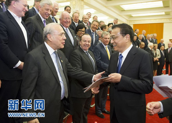 美國卡特彼勒公司董事長歐博赫曼、澳大利亞力拓集團(tuán)首席執(zhí)行官威爾士、美國聯(lián)邦快遞公司董事會主席施偉德、美國杜邦公司董事長柯愛倫、法國歐萊雅集團(tuán)董事長安鞏、美國陶氏化學(xué)公司董事長利偉誠、法國道達(dá)爾集團(tuán)董事會主席馬哲睿等分別就創(chuàng)新驅(qū)動經(jīng)濟(jì)、物流業(yè)發(fā)展、知識產(chǎn)權(quán)保護(hù)、提高能效、外企在華投資經(jīng)營環(huán)境等提問。李克強(qiáng)一一作答。