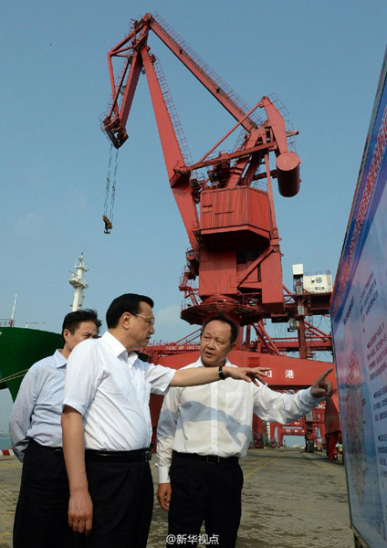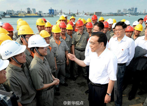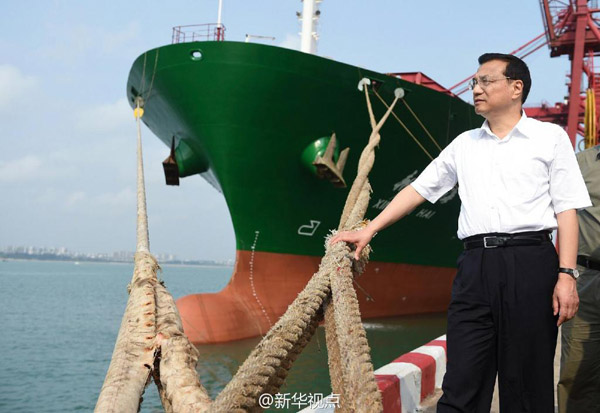 李克強總理到海口港碼頭了解貨物吞吐量及發展規劃等情況。他說,海南省四面環海,地處改革開放前沿。作為中國最大的經濟特區,海南的開放要從國家層面通盤考慮,力爭成為國家對外開放的重要支撐點,要敢闖敢試,用開放帶動、促進改革,倒逼改革。