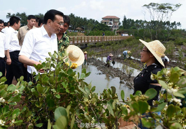 李克強在海南紅樹林保護區考察生態環保。了解到這里的紅樹林曾遭嚴重破壞,現在通過加大保護正在恢復,并吸引了大批游客來此旅游。李克強說,環保也是生產力。這里雖是紅樹林,卻是綠色的,人與自然和諧相處,生態旅游帶動了當地經濟的健康發展。