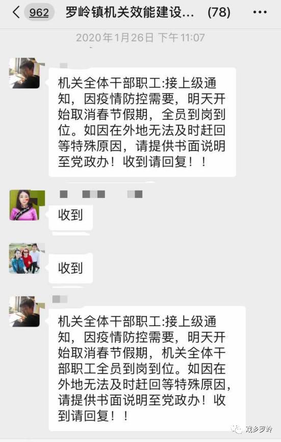 1月26日晚11:07,羅嶺鎮(zhèn)機(jī)關(guān)工作群里緊急連發(fā)了三條同樣的信息:“機(jī)關(guān)全體干部職工:接上級(jí)通知,因疫情防控需要,明天開(kāi)始取消春節(jié)假期,全員到崗到位。……收到請(qǐng)回復(fù)!!!”接下來(lái)的十分鐘,群里響起了整齊的“收到!”回復(fù)“聲”,三次緊急的微信通知吹響了羅嶺鎮(zhèn)疫情防控的集結(jié)號(hào)。