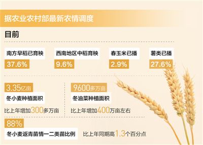 當(dāng)前,全國(guó)春季農(nóng)業(yè)生產(chǎn)如火如荼,正由南向北漸次展開。據(jù)農(nóng)業(yè)農(nóng)村部最新農(nóng)情調(diào)度,目前全國(guó)春播糧食已播4.5%,其中,南方早稻已育秧37.6%,西南地區(qū)中稻育秧9.6%,春玉米已播2.9%,薯類已播27.6%。今年冬小麥、冬油菜種植面積雙雙實(shí)現(xiàn)恢復(fù)增長(zhǎng)。冬小麥種植面積3.35億畝,比上年增加300多萬畝;冬油菜種植面積9600多萬畝,比上年增加400萬畝左右。冬小麥返青苗情一二類苗比例88%,比上年同期高1.3個(gè)百分點(diǎn)。多數(shù)地方冬小麥、冬油菜長(zhǎng)勢(shì)好于上年,實(shí)現(xiàn)夏季糧油豐收有較好基礎(chǔ)。